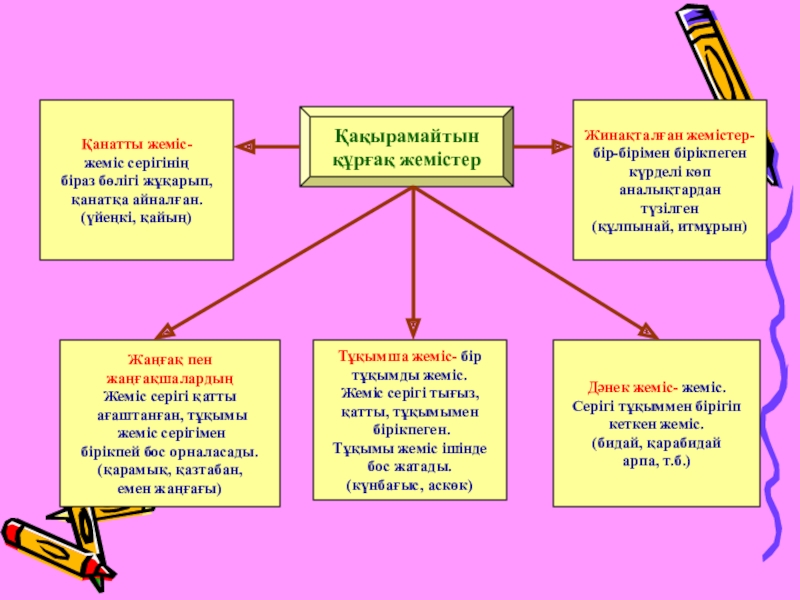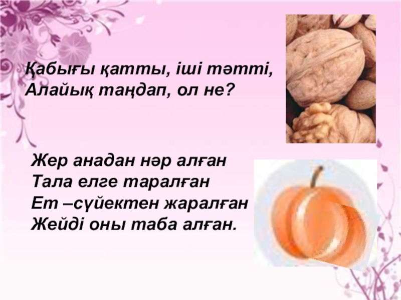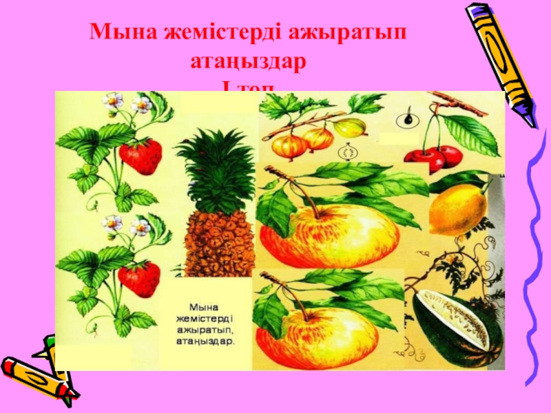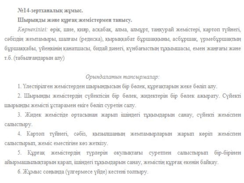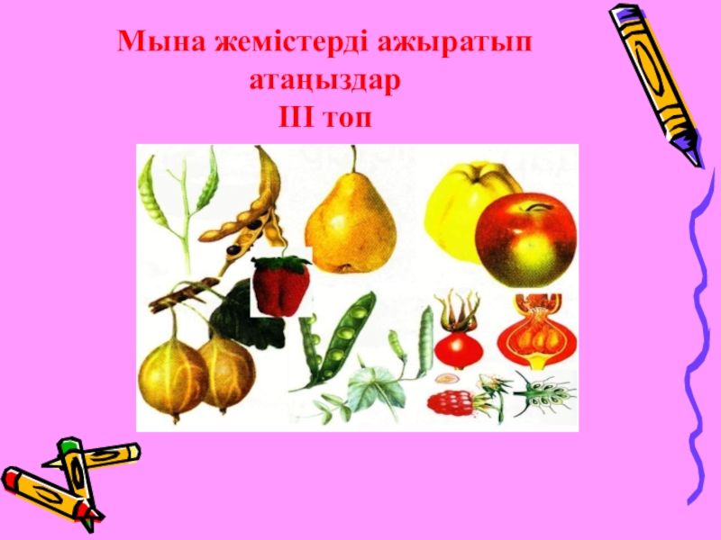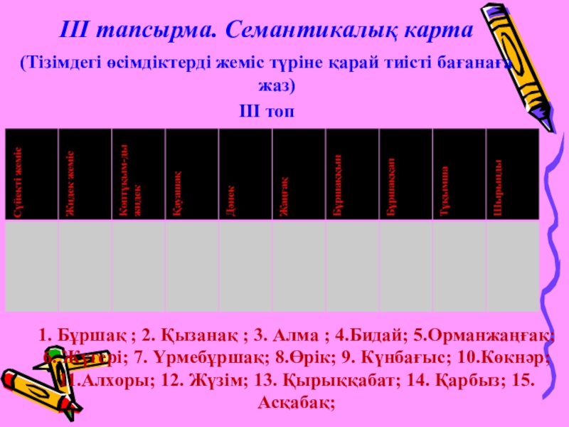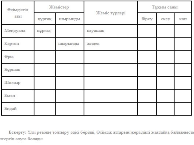 1. Бұршақ ; 2. Қызанақ ; 3. Алма ; 4.Бидай; 5.Орманжаңғақ; 6. Жүгері; 7. Үрмебұршақ; 8.Өрік; 9. Күнбағыс; 10.Көкнәр; 11.Алхоры; 12. Жүзім; 13. Қырыққабат; 14. Қарбыз; 15. Асқабақ;