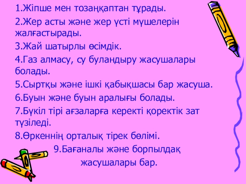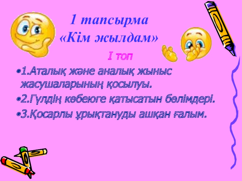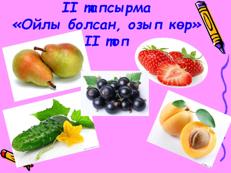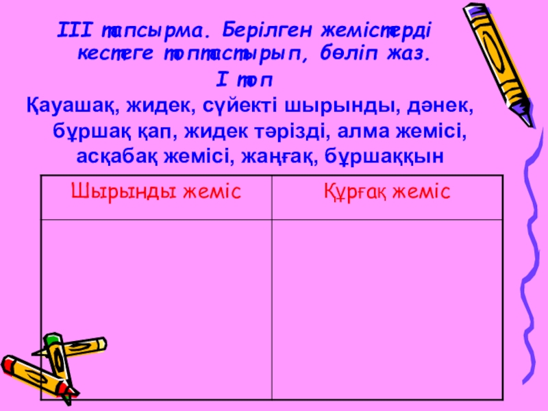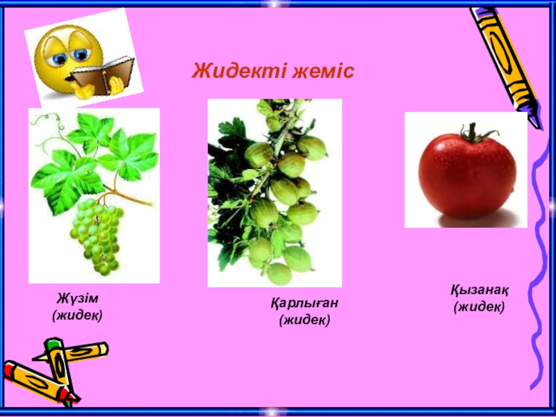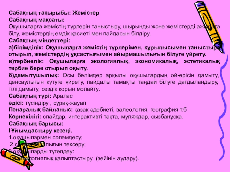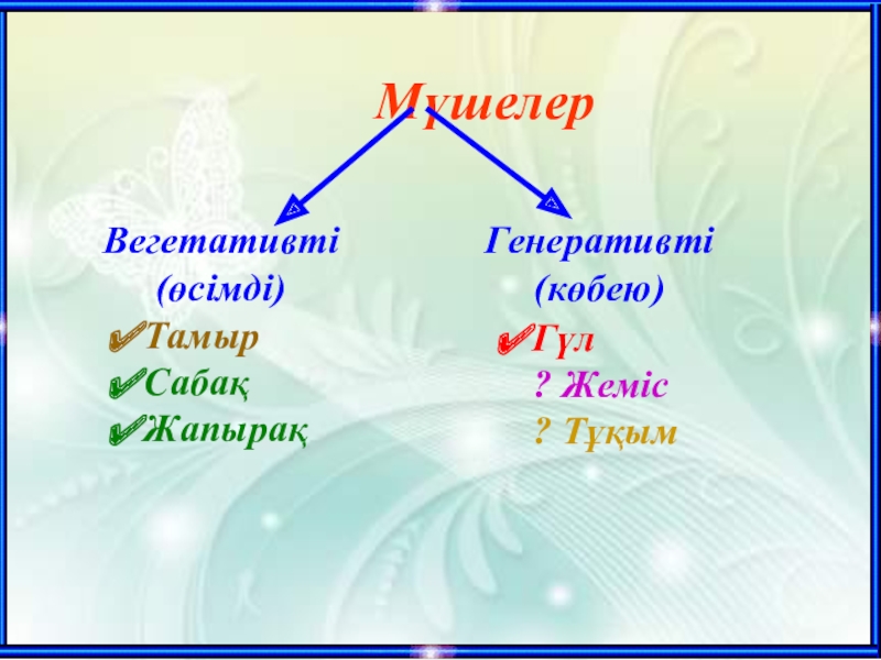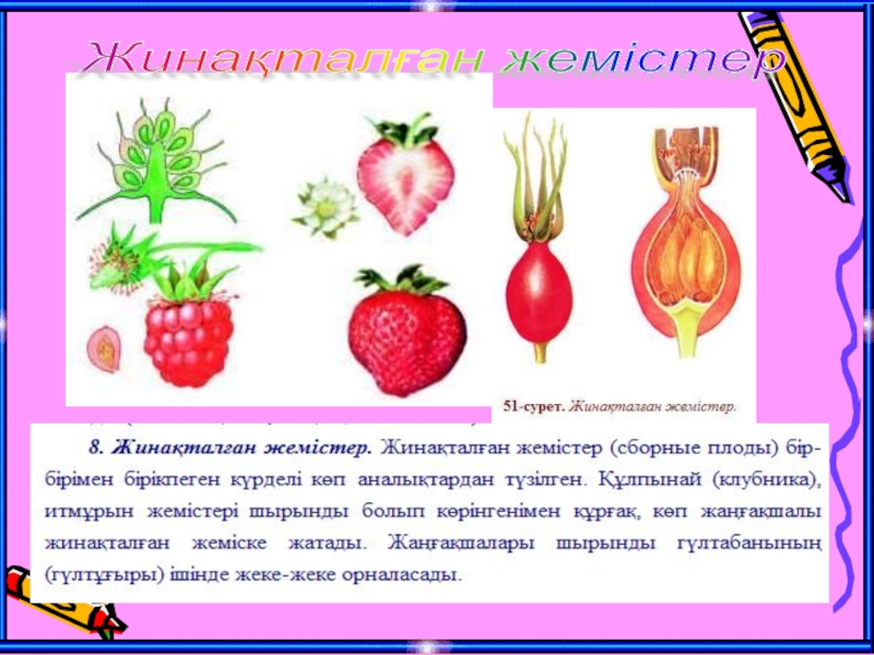 1. Бұршақ ; 2. Қызанақ ; 3. Алма ; 4.Бидай; 5.Орманжаңғақ; 6. Жүгері; 7. Үрмебұршақ; 8.Өрік; 9. Күнбағыс; 10.Көкнәр; 11.Алхоры; 12. Жүзім; 13. Қырыққабат; 14. Қарбыз; 15. Асқабақ;
