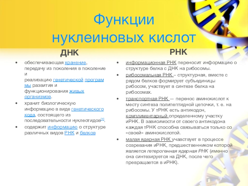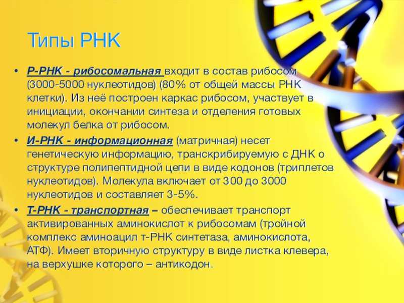 транспортная РНК — перенос аминокислот к месту синтеза полипептидной цепочки, т. е. на рибосомы. У тРНК есть антикодон, комплиментарный определенному участку иРНК. В зависимости от своего антикодона каждая тРНК способна связываться только со «своей» аминокислотой.