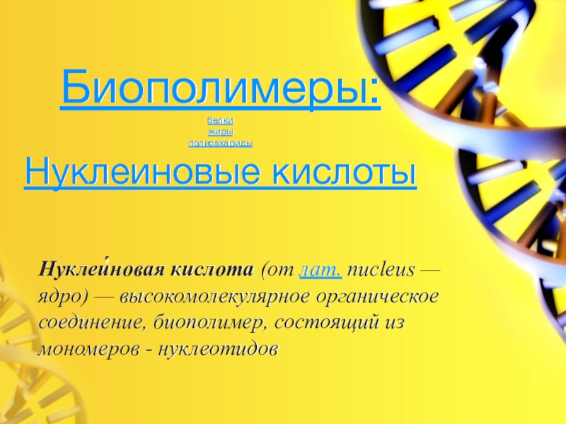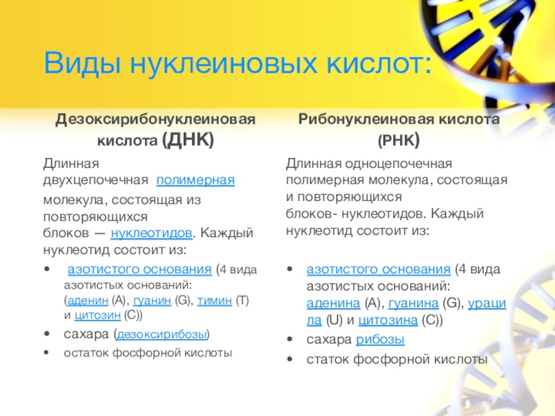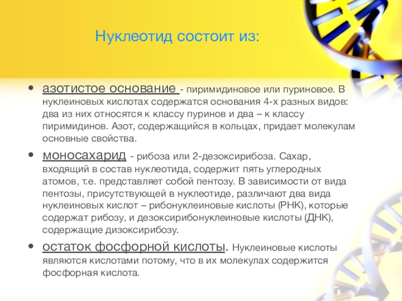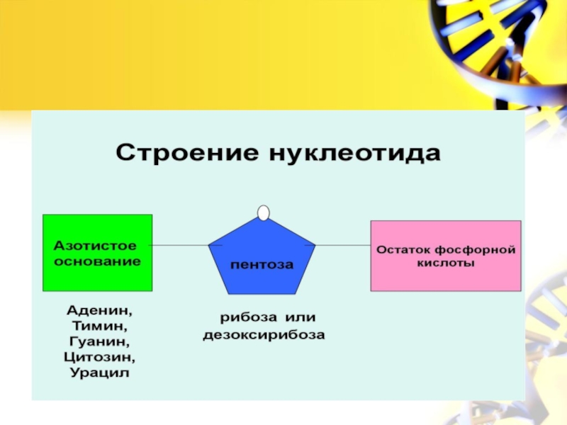 Длинная одноцепочечная полимерная молекула, состоящая и повторяющихся блоков- нуклеотидов. Каждый нуклеотид состоит из: