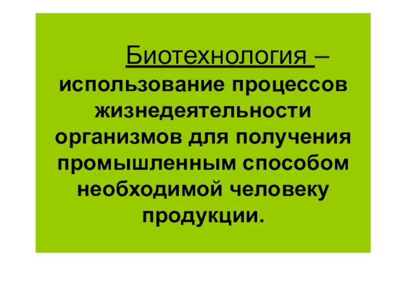 Биотехнология – использование процессов жизнедеятельности организмов для получения промышленным способом необходимой человеку продукции.
