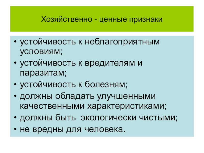 Хозяйственно - ценные признакиустойчивость к неблагоприятным условиям;устойчивость к вредителям и паразитам;устойчивость к болезням; должны обладать улучшенными качественными