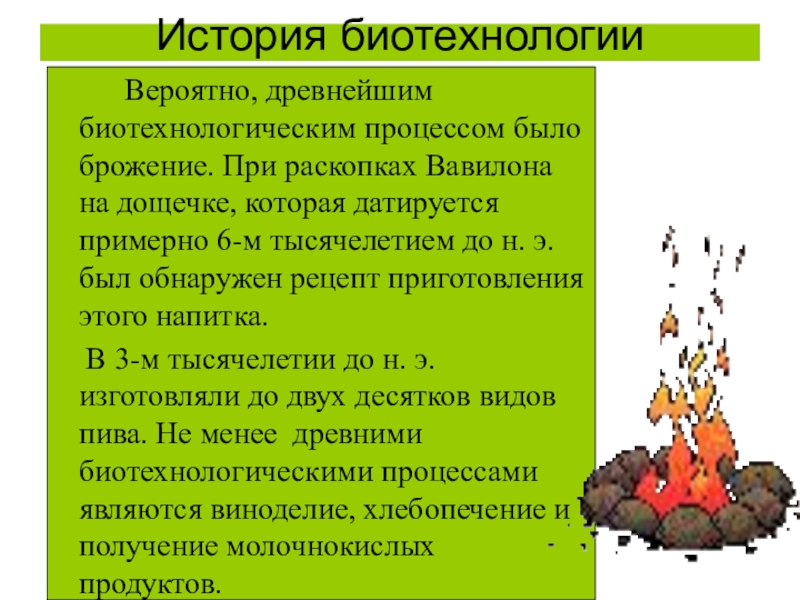 История биотехнологии     Вероятно, древнейшим биотехнологическим процессом было брожение. При раскопках Вавилона на дощечке,