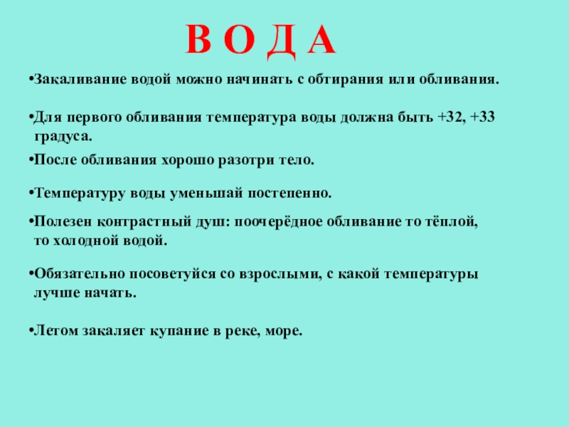 Начинать в летнее время, при температуре +16,+18 градусов; с 2 – 4 минут до 20 мин.