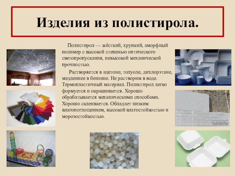 Растворяется в ацетоне, толуоле, дихлорэтане, медленнее в бензине. Не растворим в воде. Термопластичный материал. Полистирол легко формуется и окрашивается. Хорошо обрабатывается механическими способами. Хорошо склеивается. Обладает низким влагопоглощением, высокой влагостойкостью и морозостойкостью.