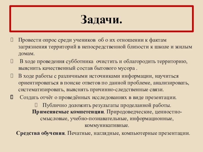 В ходе проведения субботника очистить и облагородить территорию, выяснить качественный состав бытового мусора .
