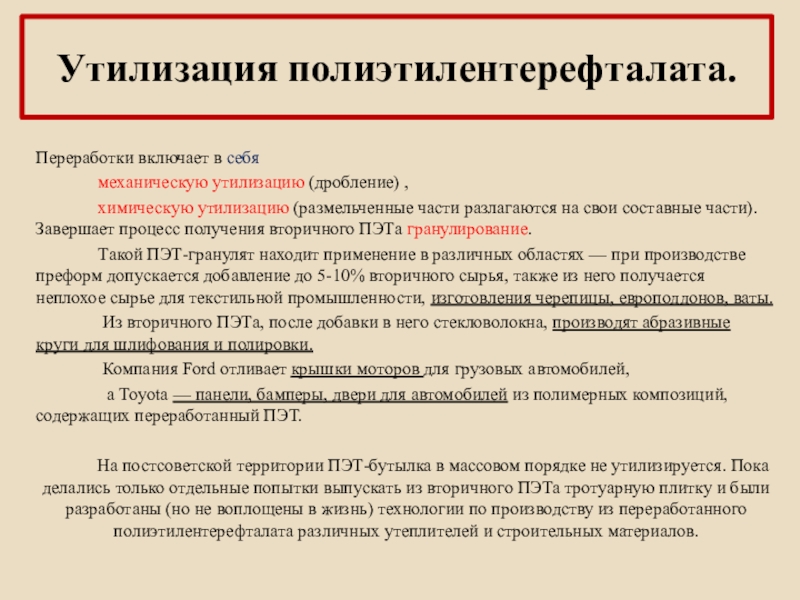 Полиэтилентерефталат (ПЭТФ, ПЭТ)- термопластик, наиболее распространённый представитель класса