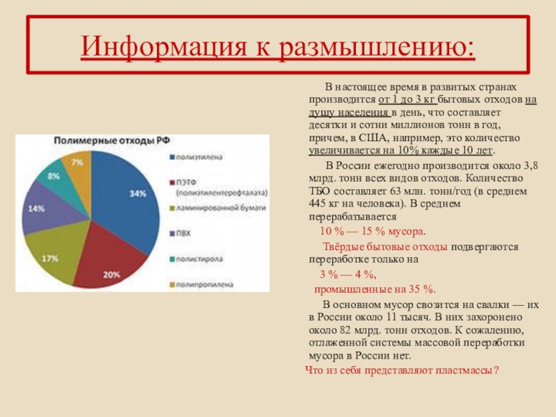 Слайд 22Отходы пластмасс — серьезный источник загрязнения окружающей среды. Отходы нуждаются в