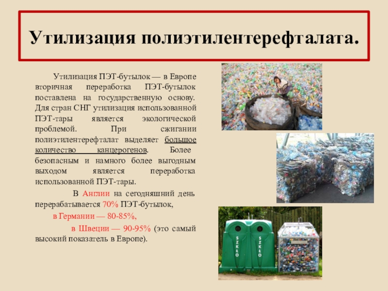 Европе вторичная переработка ПЭТ-бутылок поставлена на государственную основу. Для стран СНГ утилизация использованной ПЭТ-тары является экологической проблемой. При сжигании полиэтилентерефталат выделяет большое количество канцерогенов. Более безопасным и намного более выгодным выходом является переработка использованной ПЭТ-тары.