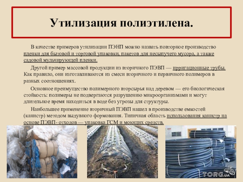 ПЭНП можно назвать повторное производство пленки для бытовой и торговой упаковки, пакетов для несыпучего мусора, а также садовой мульчирующей пленки.