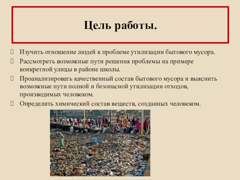 Проанализировать качественный состав бытового мусора и выяснить возможные пути полной и безопасной утилизации отходов, производимых человеком.