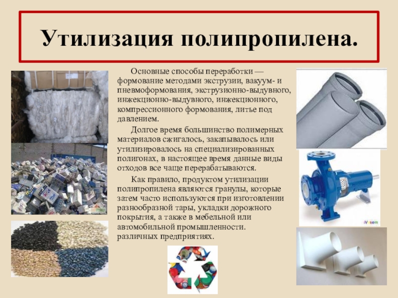 Как правило, продуктом утилизации полипропилена являются гранулы, которые затем часто используются при изготовлении разнообразной тары, укладки дорожного покрытия, а также в мебельной или автомобильной промышленности.