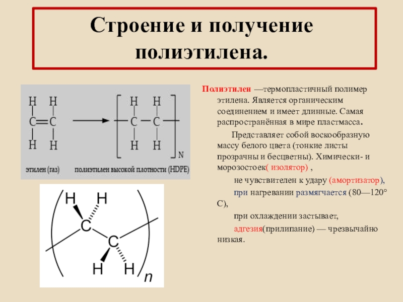 Полиэтилен —термопластичный полимер этилена. Является органическим соединением и имеет