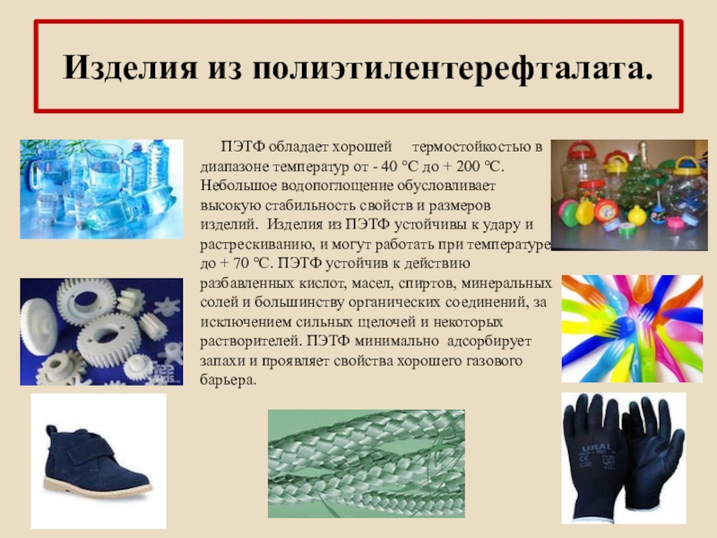 ПЭТФ обладает хорошей термостойкостью в диапазоне температур от - 40 °С до + 200 °С. Небольшое водопоглощение обусловливает высокую стабильность свойств и размеров изделий. Изделия из ПЭТФ устойчивы к удару и растрескиванию, и могут работать при температуре до + 70 °С. ПЭТФ устойчив к действию разбавленных кислот, масел, спиртов, минеральных солей и большинству органических соединений, за исключением сильных щелочей и некоторых растворителей. ПЭТФ минимально адсорбирует запахи и проявляет свойства хорошего газового барьера.