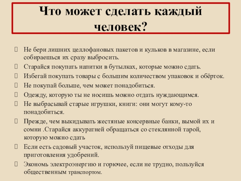 Прежде, чем выкидывать жестяные консервные банки, вымой их и сомни .Старайся аккуратней обращаться со стеклянной тарой, которую можно сдать