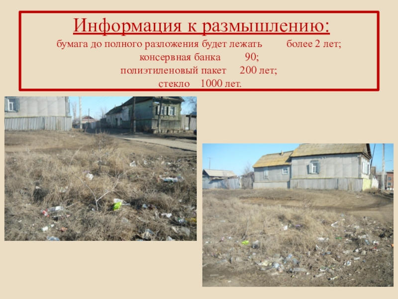 обитания необходимо и возможно своими силами. Начать нужно с территории, вокруг своего дома, со своей улицы, навести порядок в своём городе. Ребята на практике выясняли из каких компонентов состоит бытовой мусор.