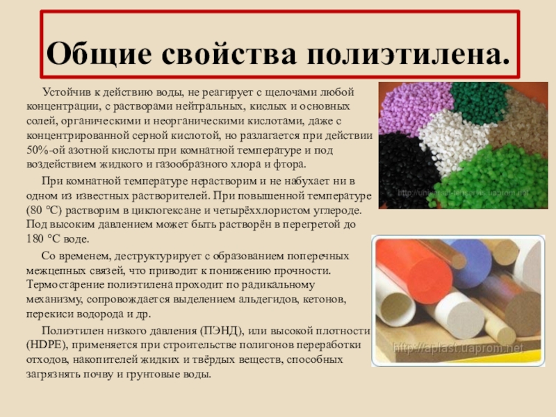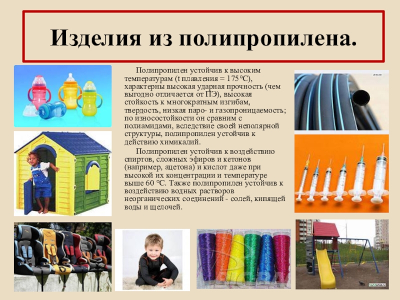 к высоким температурам (t плавления = 175°С), характерны высокая ударная прочность (чем выгодно отличается от ПЭ), высокая стойкость к многократным изгибам, твердость, низкая паро- и газопроницаемость; по износостойкости он сравним с полиамидами, вследствие своей неполярной структуры, полипропилен устойчив к действию химикалий.