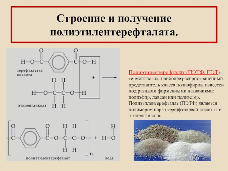 полиэфиров, известен под разными фирменными названиями: полиэфир, лавсан или полиэстер. Полиэтилентерефталат (ПЭТФ) является полимером пара-(тере)фталевой кислоты и этиленгликоля.