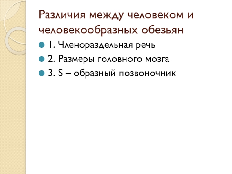Различия между человеком и человекообразных обезьян1. Членораздельная речь2. Размеры головного мозга3. S – образный позвоночник