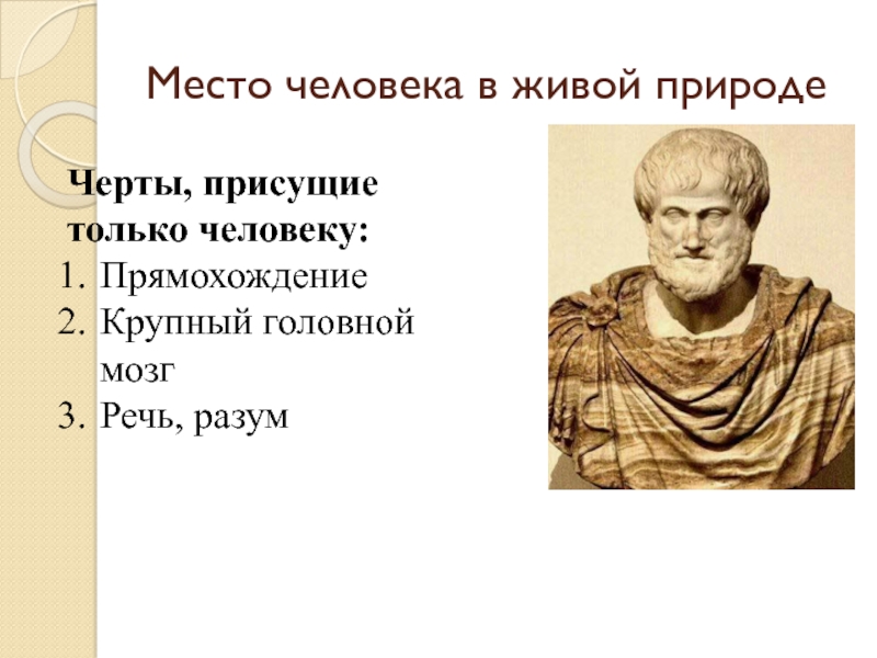 Место человека в живой природеЧерты, присущие только человеку:ПрямохождениеКрупный головной мозгРечь, разум