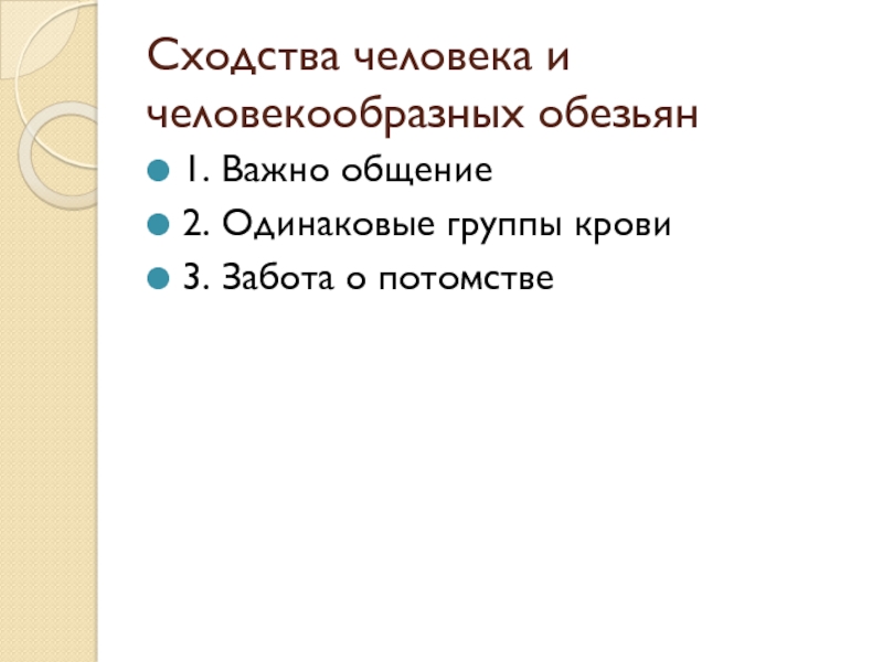 Сходства человека и человекообразных обезьян1. Важно общение2. Одинаковые группы крови3. Забота о потомстве