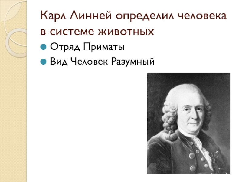 Карл Линней определил человека в системе животныхОтряд ПриматыВид Человек Разумный