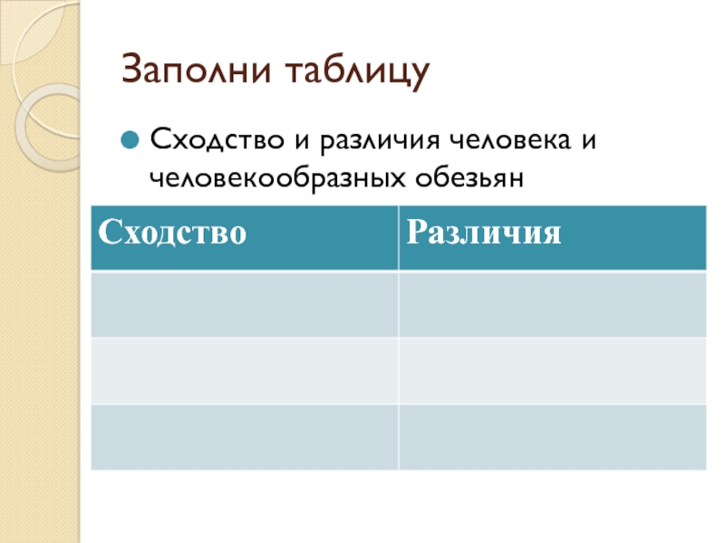 Заполни таблицуСходство и различия человека и человекообразных обезьян