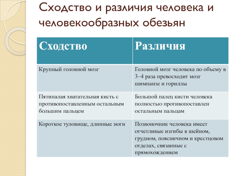 Слайд 14Сходство и различия человека и человекообразных обезьян