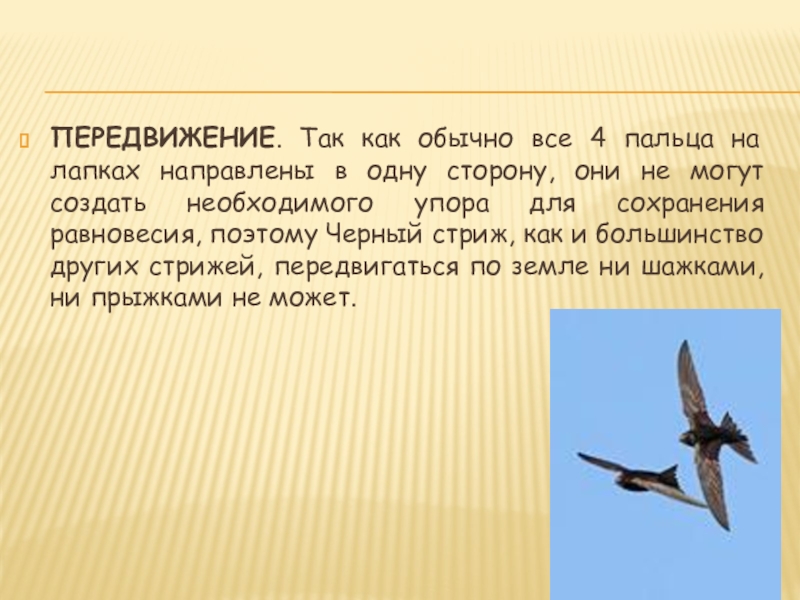 одну сторону, они не могут создать необходимого упора для сохранения равновесия, поэтому Черный стриж, как и большинство других стрижей, передвигаться по земле ни шажками, ни прыжками не может.
