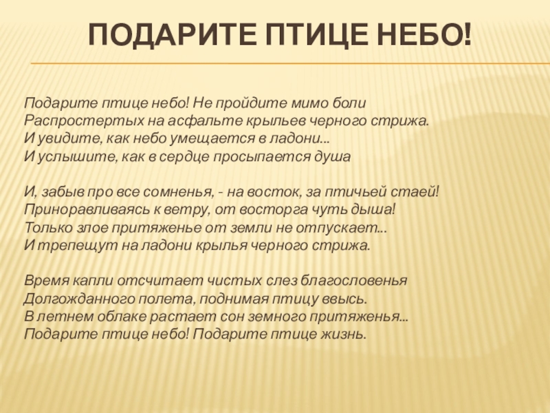 Слайд 15ПОДАРИТЕ ПТИЦЕ НЕБО!