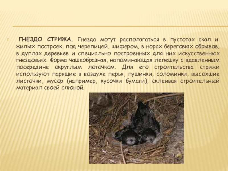 ГНЕЗДО СТРИЖА. Гнезда могут располагаться в пустотах скал и жилых