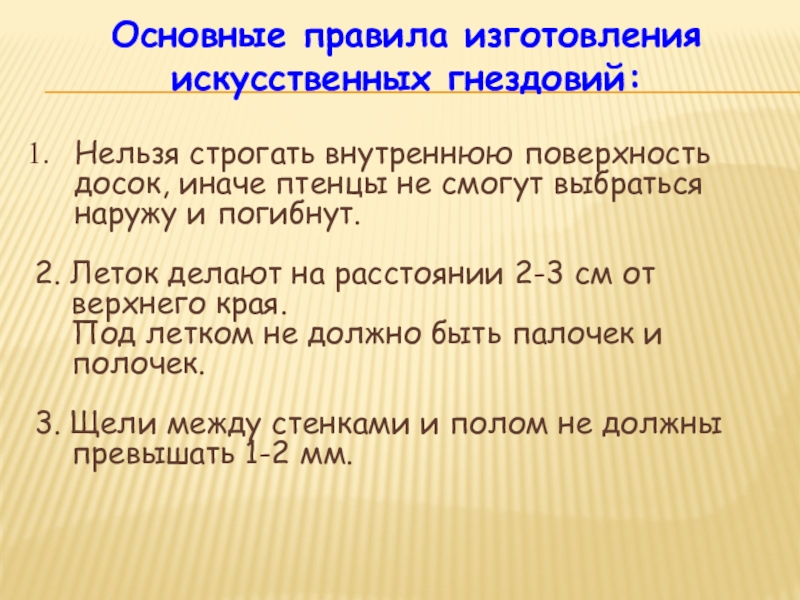 Слайд 13Основные правила изготовления искусственных гнездовий: