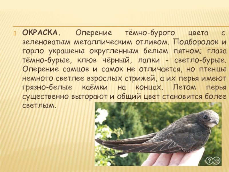 Слайд 4ОКРАСКА. Оперение тёмно-бурого цвета с зеленоватым металлическим отливом. Подбородок и горло