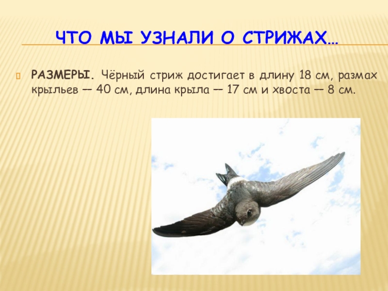 РАЗМЕРЫ. Чёрный стриж достигает в длину 18 см,