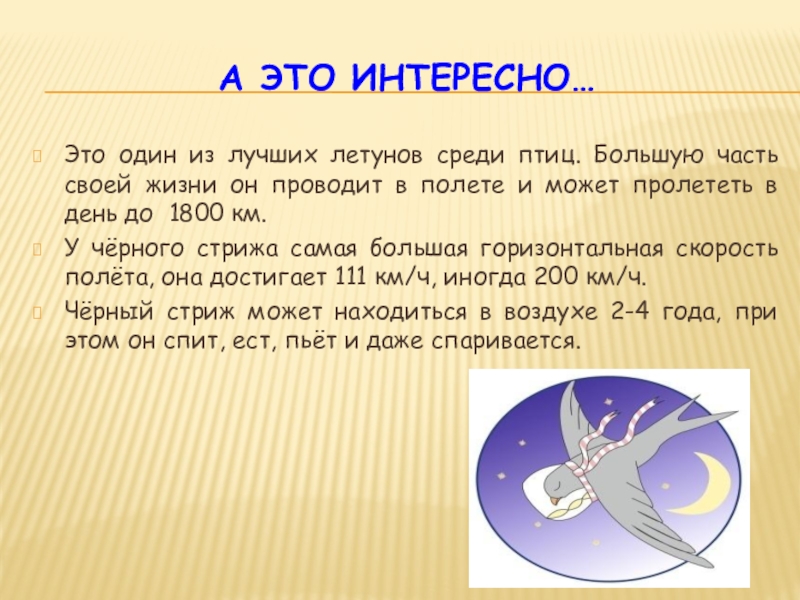 Чёрный стриж может находиться в воздухе 2-4 года, при этом он спит, ест, пьёт и даже спаривается.