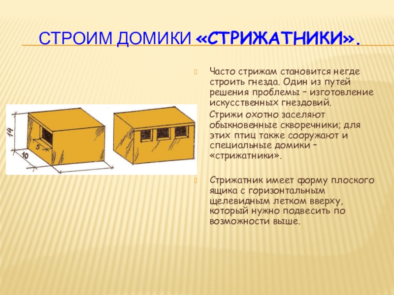Стрижатник имеет форму плоского ящика с горизонтальным щелевидным летком вверху, который нужно подвесить по возможности выше.