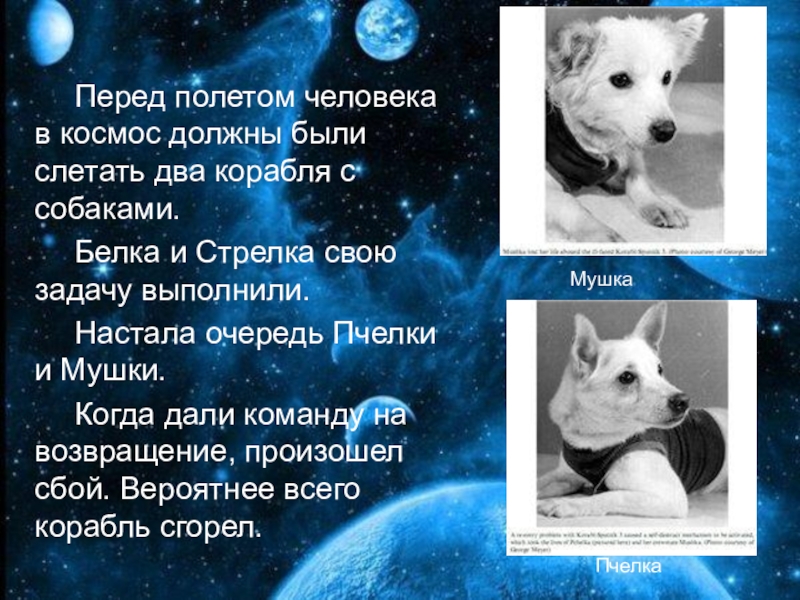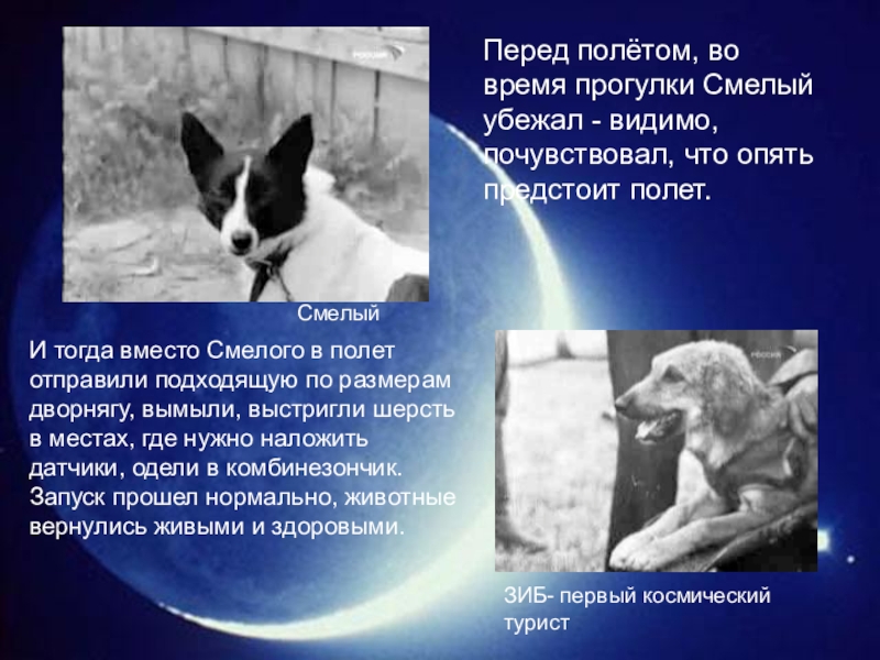 И тогда вместо Смелого в полет отправили подходящую по размерам дворнягу, вымыли, выстригли шерсть в местах, где нужно наложить датчики, одели в комбинезончик. Запуск прошел нормально, животные вернулись живыми и здоровыми.
