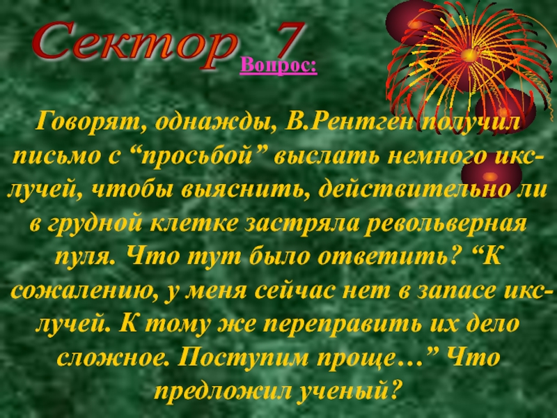 немного икс-лучей, чтобы выяснить, действительно ли в грудной клетке застряла револьверная пуля. Что тут было ответить? “К сожалению, у меня сейчас нет в запасе икс-лучей. К тому же переправить их дело сложное. Поступим проще…” Что предложил ученый?