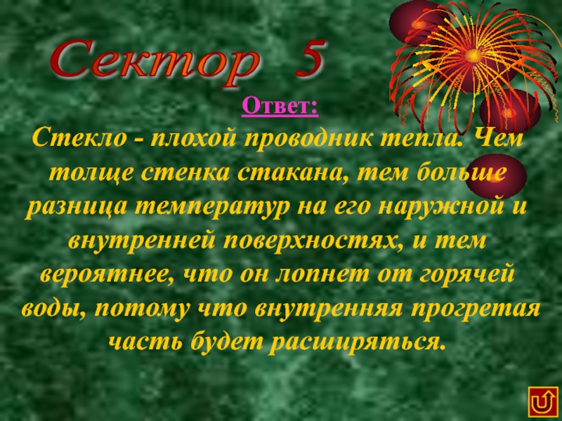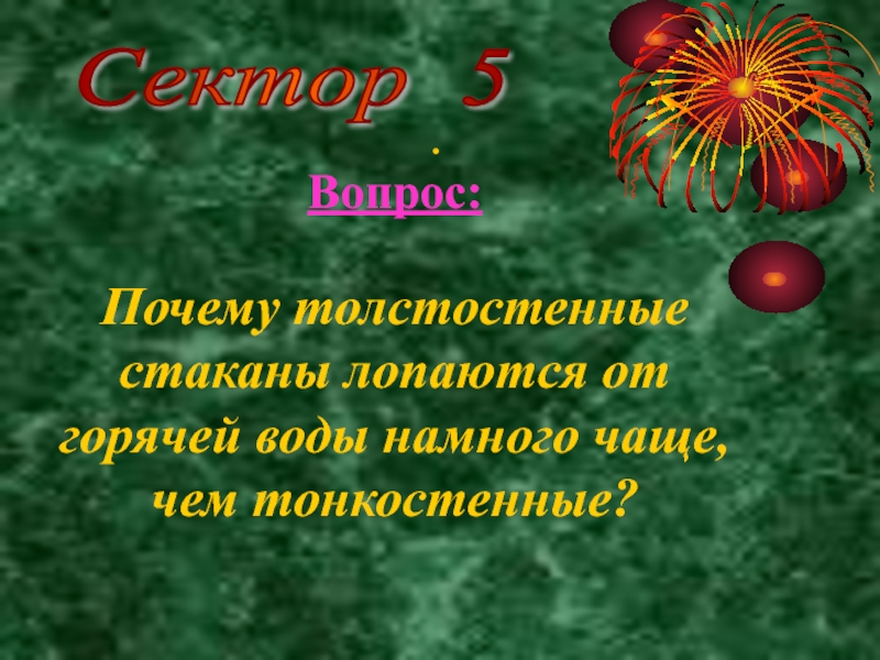 стакана, тем больше разница температур на его наружной и внутренней поверхностях, и тем вероятнее, что он лопнет от горячей воды, потому что внутренняя прогретая часть будет расширяться.