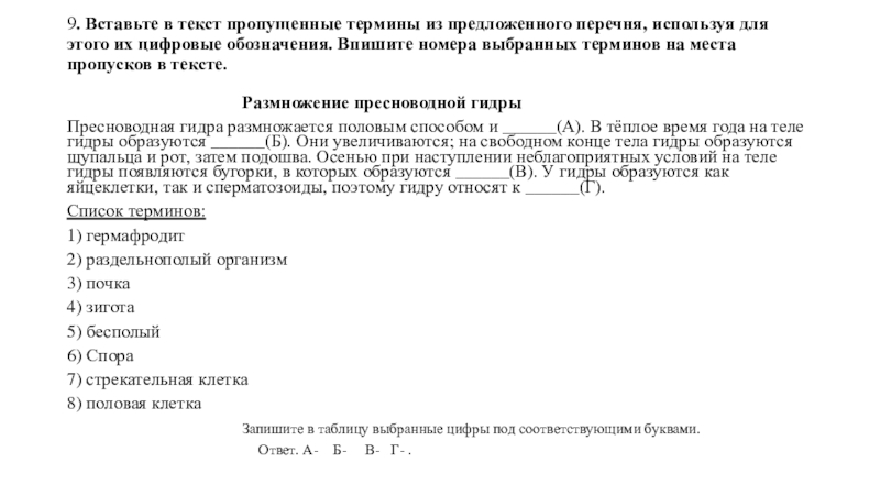 Пресноводная гидра размножается половым способом и ______(А). В тёплое время года на теле гидры образуются ______(Б). Они увеличиваются; на свободном конце тела гидры образуются щупальца и рот, затем подошва. Осенью при наступлении неблагоприятных условий на теле гидры появляются бугорки, в которых образуются ______(В). У гидры образуются как яйцеклетки, так и сперматозоиды, поэтому гидру относят к ______(Г).