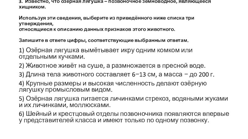 5) Озёрная лягушка питается личинками стрекоз, водяными жуками и их личинками, моллюсками.