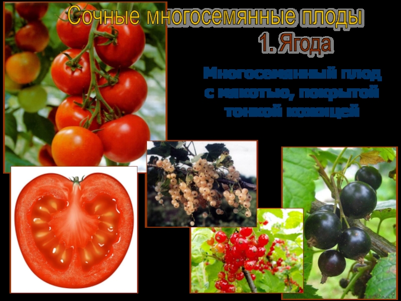 Сочные многосемянные плоды1. ЯгодаМногосемянный плод с мякотью, покрытой тонкой кожицей