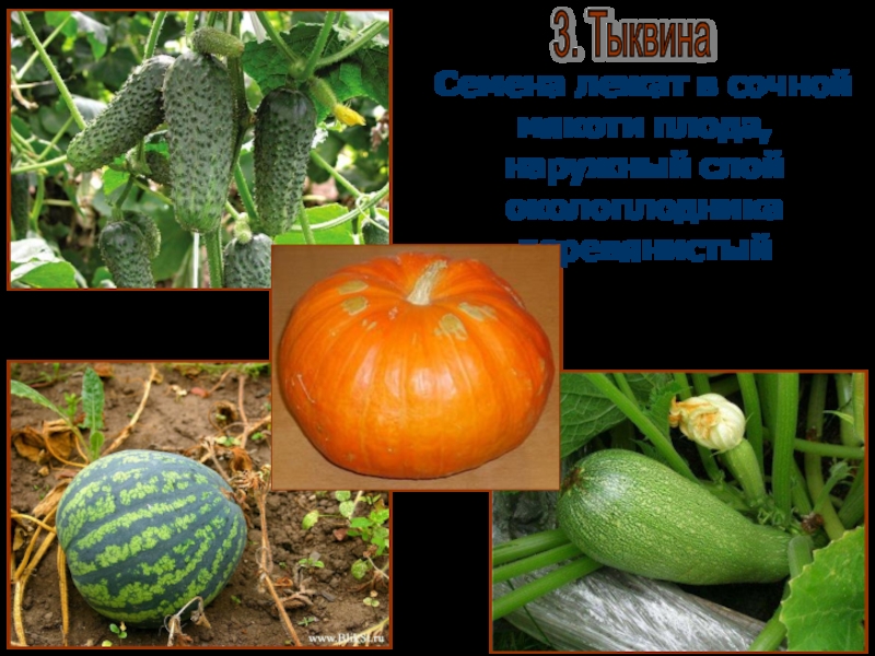 3. ТыквинаСемена лежат в сочной мякоти плода, наружный слой околоплодника деревянистый