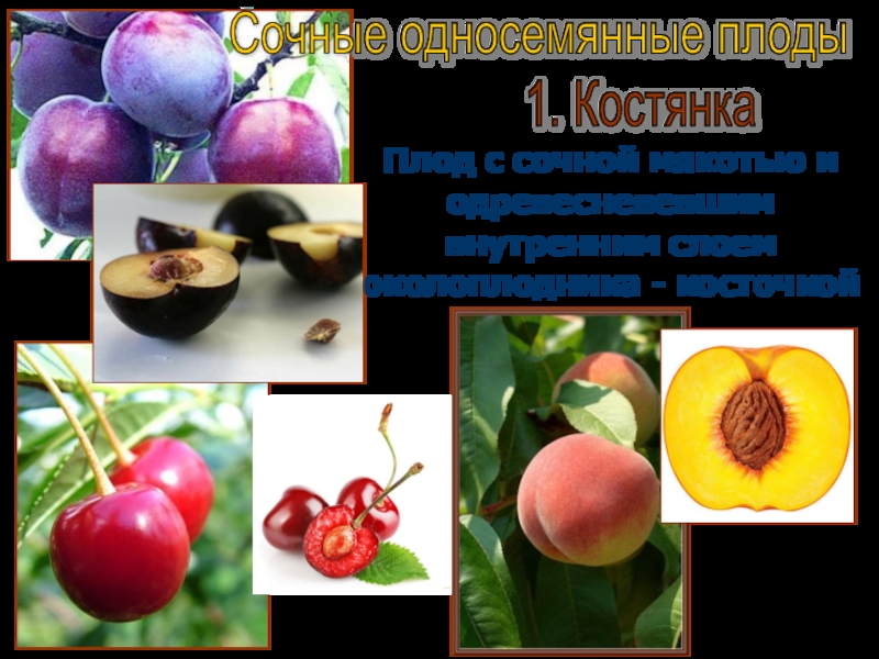 Сочные односемянные плоды1. КостянкаПлод с сочной мякотью и одревесневевшим внутренним слоем околоплодника - косточкой