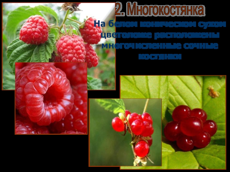 2. МногокостянкаНа белом коническом сухом цветоложе расположены многочисленные сочные костянки