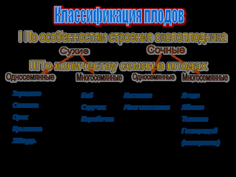 Классификация плодовI По особенностям строения околоплодникаСухиеСочныеIIПо количеству семян в плодахОдносемянныеМногосемянныеОдносемянныеМногосемянныеЗерновкаСемянкаОрехКрылаткаЖёлудьБобСтручокКоробочкаКостянкаМногокостянкаЯгодаЯблокоТыквинаГесперидий(померанец)