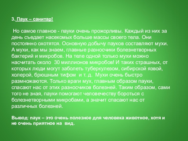 прожорливы. Каждый из них за день съедает насекомых больше массы своего тела. Они постоянно охотятся. Основную добычу пауков составляют мухи. А мухи, как мы знаем, главные разносчики болезнетворных бактерий и микробов. На теле одной только мухи можно насчитать около 30 миллионов микробов! И таких страшных, от которых люди могут заболеть туберкулезом, сибирской язвой, холерой, брюшным тифом и т. д. Мухи очень быстро размножаются. Только враги мух, главным образом пауки, спасают нас от этих разносчиков болезней. Таким образом, сами того не зная, пауки помогают человечеству бороться с болезнетворными микробами, а значит спасают нас от различных болезней.