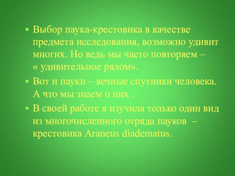 Слайд 8Выбор паука-крестовика в качестве предмета исследования, возможно удивит многих. Но ведь