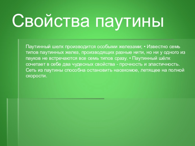 желез, производящих разные нити, но ни у одного из пауков не встречаются все семь типов сразу. • Паутинный шёлк сочетает в себе два чудесных свойства - прочность и эластичность. Сеть из паутины способна остановить насекомое, летящее на полной скорости.