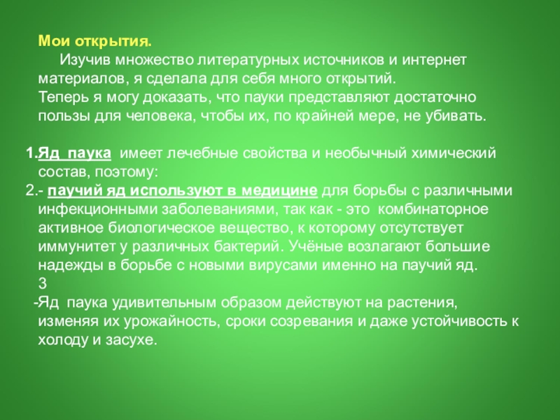Вывод: паук – это очень полезное для человека животное, хотя и не очень приятное на вид.
